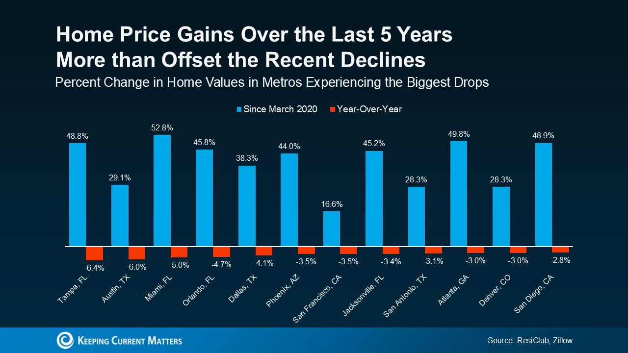 In short, these slight dips don’t come close to wiping out the substantial gains of recent years. Homeowners who’ve owned their properties for a while are still far ahead—by a wide margin—and that’s consistent across nearly every market.