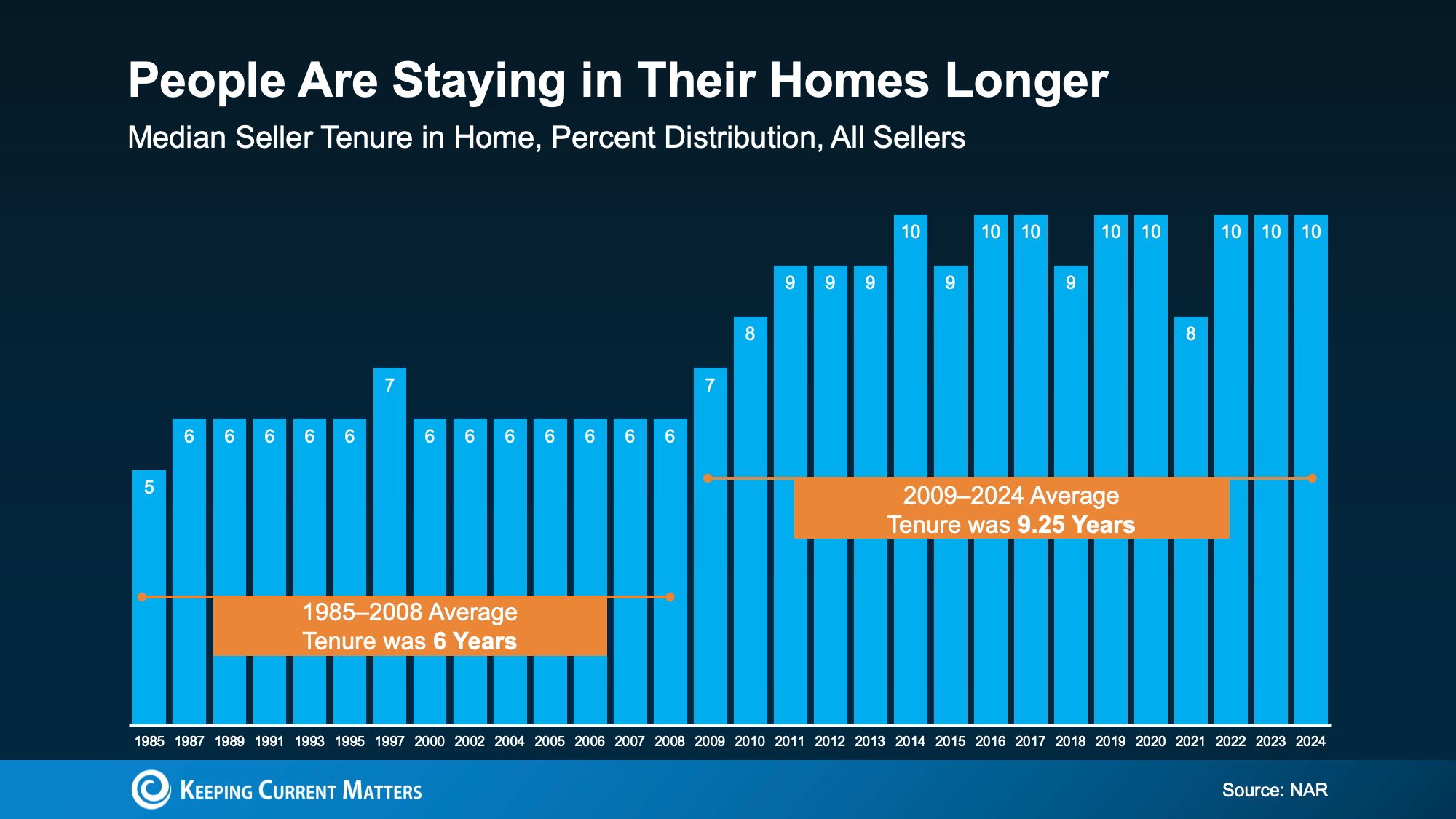 2. Homeowners Are Staying Put Longer. According to data from the National Association of Realtors (NAR), the average homeowner now stays in their home for about 10 years (see graph below):
