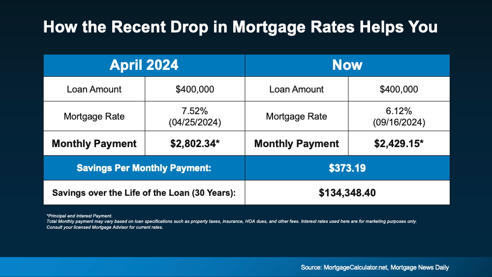 Curious about how this affects your payment? Let’s break it down. The chart below compares the monthly payment (principal and interest) on a $400K home loan if you bought a house at the mortgage rate peak in April to what your payment could be with today’s lower rates.