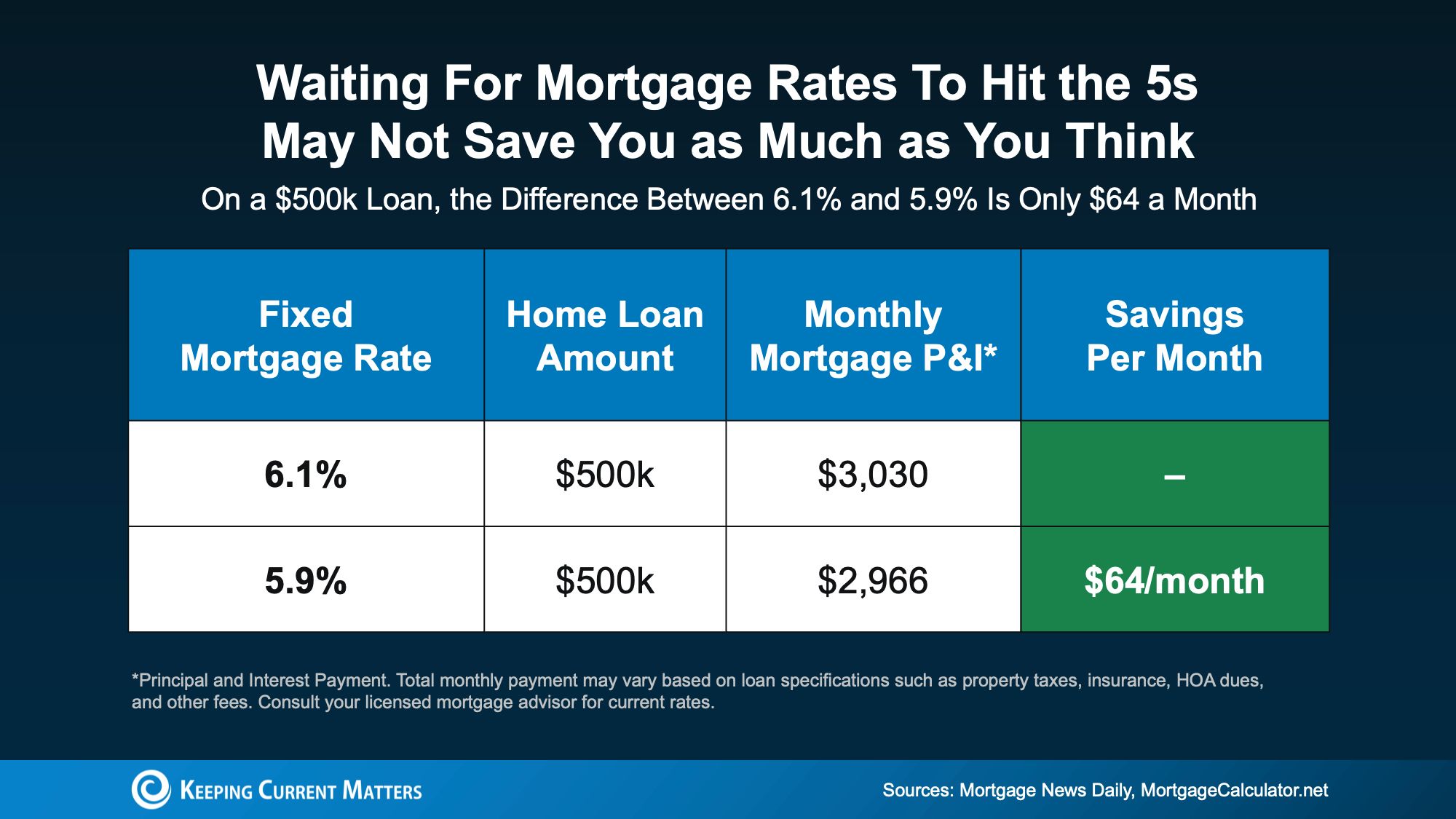 { "@context": "https://schema.org", "@type": "FAQPage", "mainEntity": [ { "@type": "Question", "name": "Many buyers seem fixated on mortgage rates dropping into the 5% range. How significant is that psychological threshold?", "acceptedAnswer": { "@type": "Answer", "text": "The 5% mark carries a strong psychological pull because seeing a 5 at the start of a rate feels very different than seeing a 6. But while that perception is understandable, the financial reality is often less dramatic. On a $500,000 loan, the monthly principal and interest payment difference between 6.1% and 5.9% is only about $64 per month, which is far less than many buyers expect when they talk about waiting for rates in the 5s." } }, { "@type": "Question", "name": "Can you break down the actual payment difference between 6.1% and 5.9% on a $500,000 loan?", "acceptedAnswer": { "@type": "Answer", "text": "At 6.1%, the principal and interest payment on a $500,000 loan is approximately $3,030 per month. At 5.9%, that payment drops to around $2,966 per month, a difference of just $64. While that amount does add up over time, it is far from the $300 to $500 monthly savings many buyers imagine when they decide to wait for rates to fall into the 5% range." } }, { "@type": "Question", "name": "What are housing economists currently projecting for mortgage rates?", "acceptedAnswer": { "@type": "Answer", "text": "Most housing economists are not forecasting a sustained return to the 5% range in the near term. The broader consensus is that mortgage rates are more likely to hover in the low 6% range for the foreseeable future. While occasional dips into the high 5s are possible, buyers expecting a prolonged and meaningful rate decline may end up waiting much longer than anticipated." } }, { "@type": "Question", "name": "What's a better question for buyers to ask themselves instead of \"Did I miss rates in the 5s?\"", "acceptedAnswer": { "@type": "Answer", "text": "A more strategic question is, \"Does today's payment fit my budget?\" Rather than anchoring a decision to a specific interest rate number, buyers should focus on whether the current monthly payment is manageable and whether the home meets their needs. A small difference in rate may matter, but it usually should not be the only factor driving the decision." } }, { "@type": "Question", "name": "What role does refinancing play in the decision to buy now versus wait?", "acceptedAnswer": { "@type": "Answer", "text": "Refinancing gives buyers an important option if rates drop meaningfully after they purchase. Homeowners can refinance into a lower rate and potentially reduce their monthly payment. Buyers who remain on the sidelines do not have that flexibility, because you cannot refinance a home you never bought or capture the equity, appreciation, and stability that can come with ownership during the waiting period." } }, { "@type": "Question", "name": "How much have mortgage rates already improved compared to a year ago?", "acceptedAnswer": { "@type": "Answer", "text": "Mortgage rates have already improved meaningfully. About a year ago, many rates were in the 7% range, while today they are hovering in the low 6s. That roughly one-percentage-point improvement has already reduced monthly payments in a real way for many buyers, and for some, that shift is more impactful than waiting for a much smaller drop from 6.1% to 5.9%." } }, { "@type": "Question", "name": "Is waiting for a lower rate always a bad strategy?", "acceptedAnswer": { "@type": "Answer", "text": "Not always. Waiting can make sense if current payments genuinely do not fit a buyer's budget or if there is a strong reason to believe a meaningful rate drop is likely. The challenge is that many buyers overestimate how much a modest rate reduction will change their monthly payment, or assume a major drop is right around the corner without clear evidence. In that case, the opportunity cost of waiting can outweigh the benefit." } }, { "@type": "Question", "name": "What should buyers do if they've been waiting on the sidelines?", "acceptedAnswer": { "@type": "Answer", "text": "The most practical next step is to revisit the numbers using today's mortgage rates and the price range of homes you are considering. Many buyers find that the payment is more manageable than they expected. If the monthly cost works for your budget, there may be less reason to keep waiting. Talking with a trusted real estate agent or lender to run a personalized analysis is a smart place to start." } } ] }