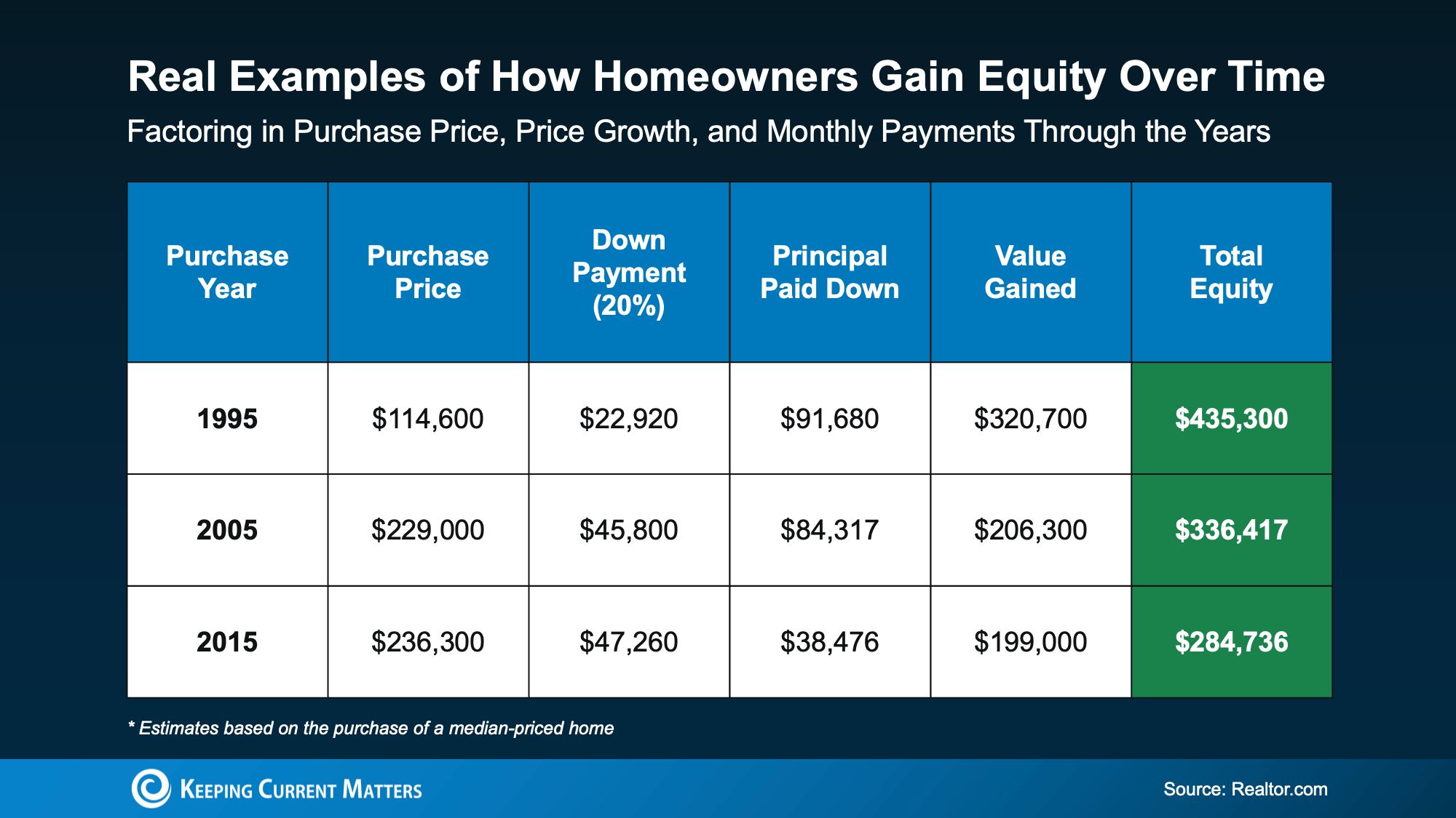 - Bought in 2015? Even in just a decade, equity gains often reach around $285K.